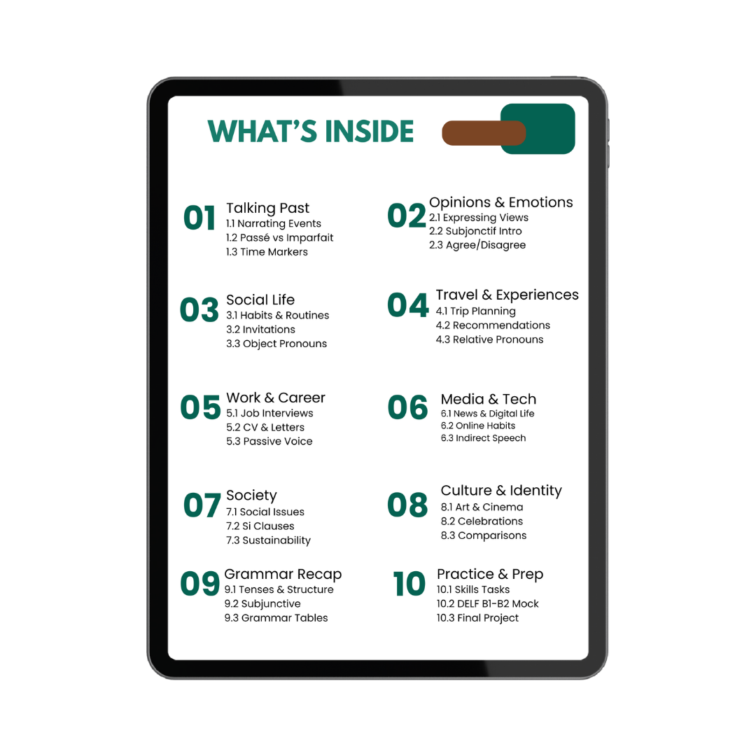 French Breakthrough (B1–B2) is a complete self-study eBook created for learners who already have a basic foundation in French and want to move confidently toward an upper-intermediate level.