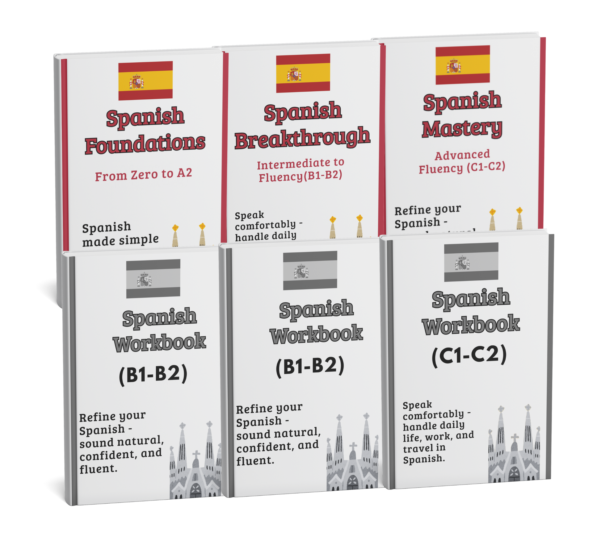 This pack includes 3 structured eBooks covering Foundations (A1–A2), Breakthrough (B1–B2), and Mastery (C1–C2), along with 3 complementary workbooks created to reinforce each level through practical, hands-on exercises.